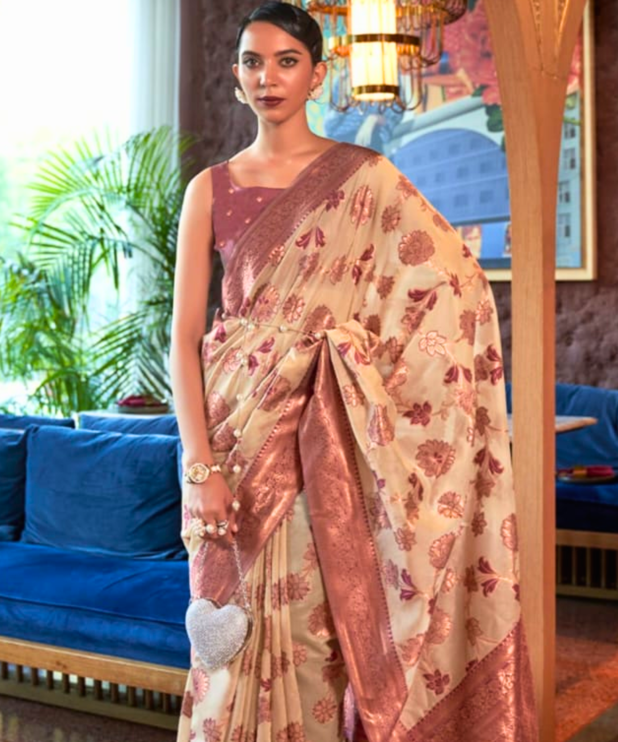 Elevate your traditional attire with the Kia silk saree, featuring full weaving and a lustrous finish that exudes sophistication. Perfect for weddings and formal events, this saree combines classic weaving techniques with contemporary elegance.